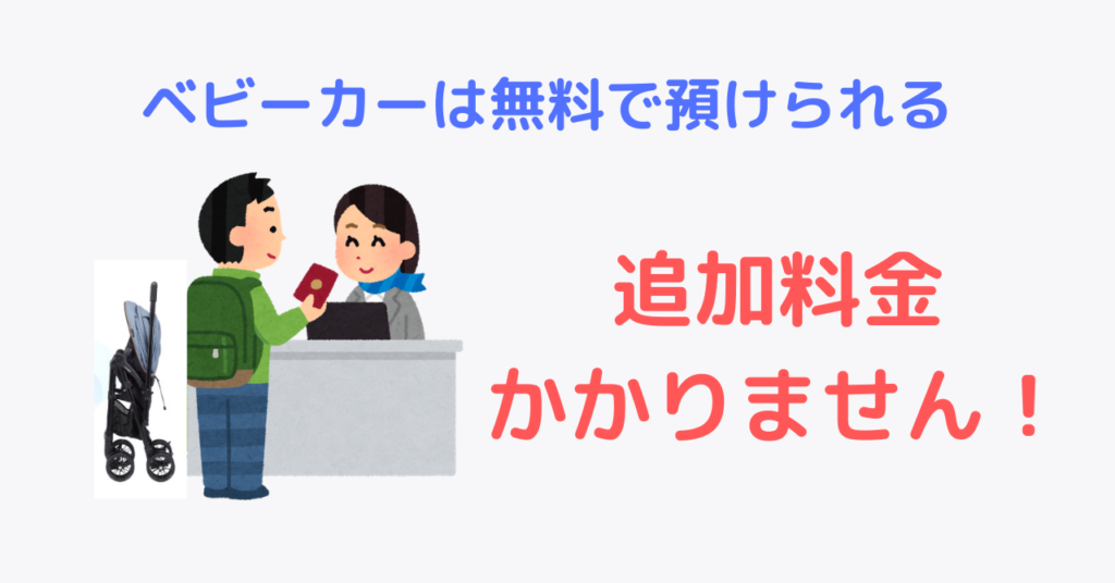 ベビーカーを預けるときに、形的にいびつなので別途費用がかかってしまうのでは!?と思う人もいるかもしれませんが、一般的な航空会社やLCCは基本的に無料で預かってもらえるので、安心です。