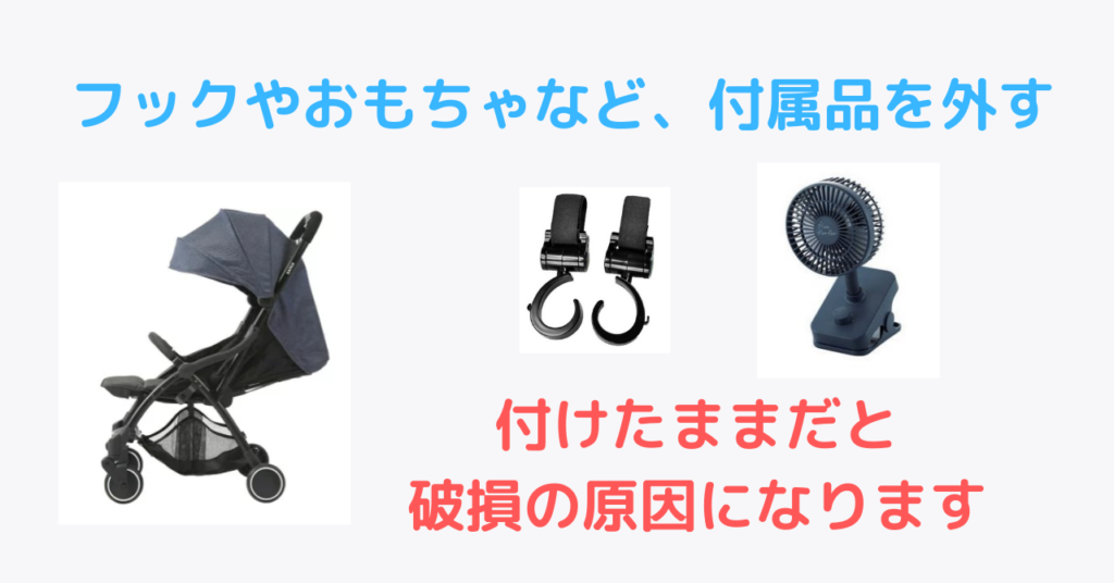 ベビーカーについているフックやおもちゃなどの付属品は、予め外しておきましょう。